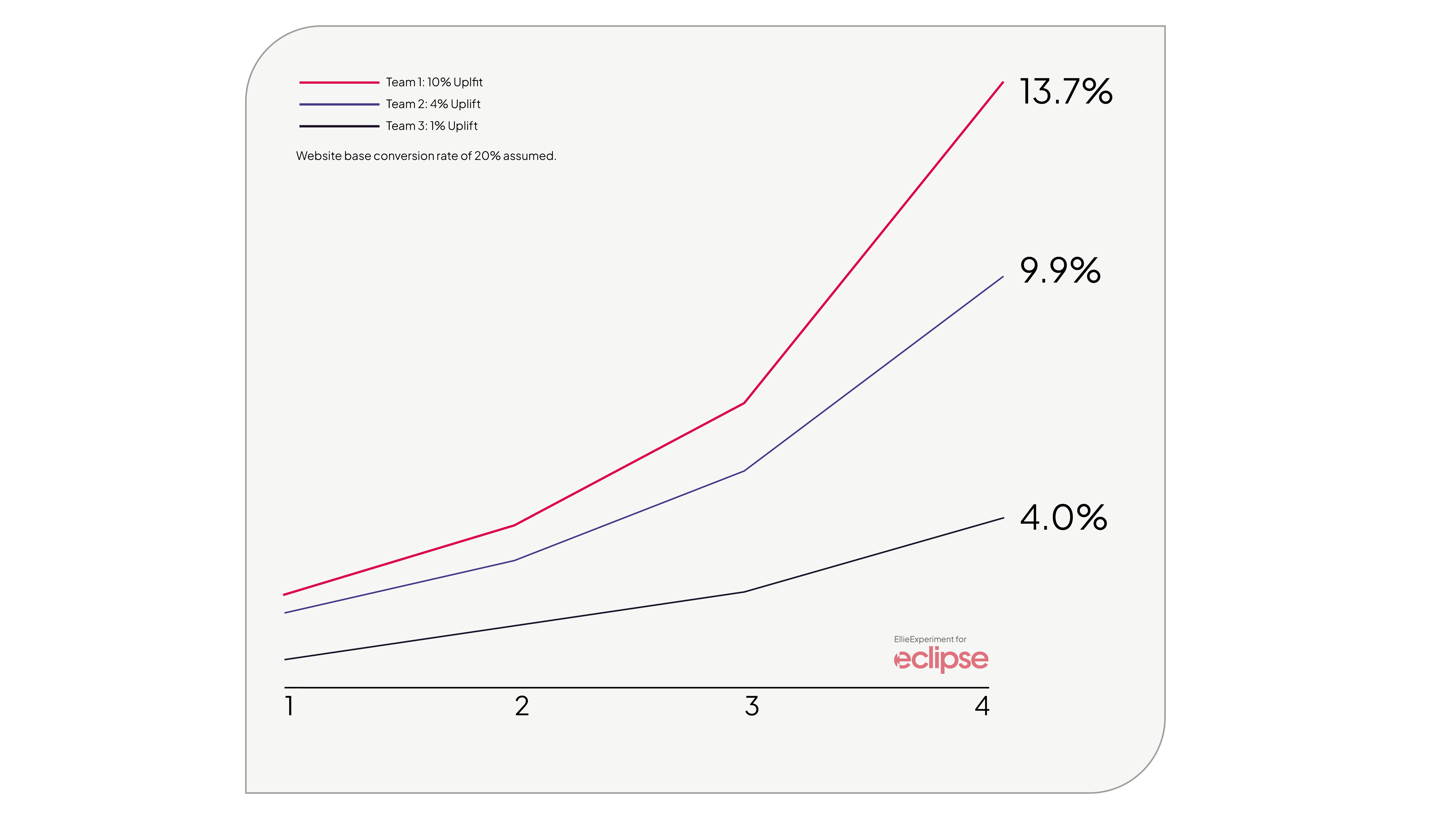 Team 1: Focuses on highly complex tests, achieving a 10% uplift, but only delivers 1 experiment per month.
